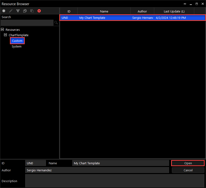 2.On the Resource Browser window, select the "Custom" Resource folder, then the My Chart Template on the pane to the right and click on the "Open" button to load the chart template on the chart (shown in the red rectangles below):
