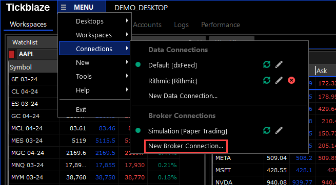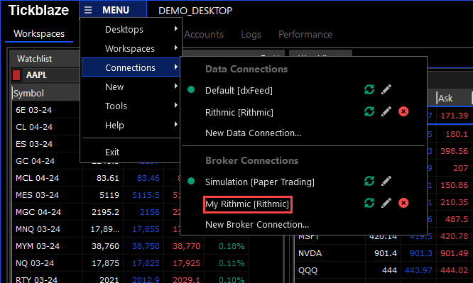 11.The new broker connection will now appear as an available connection in the Tickblaze Desktop MENU/Connections sub-menu as shown in the red rectangle below: