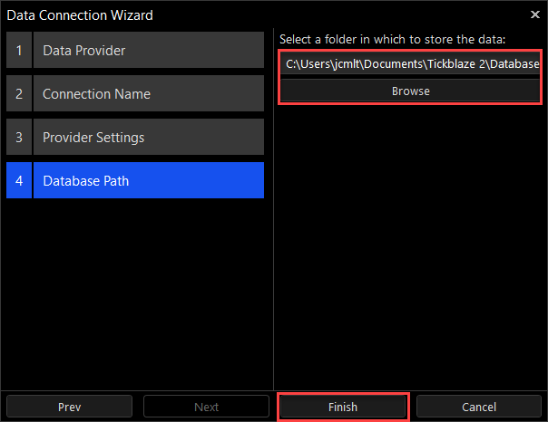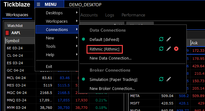 12.The new data connection will now appear as an available connection in the Tickblaze Desktop MENU/Connections sub-menu as shown in the red rectangle below: