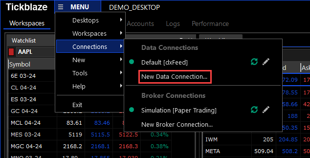 The Tickblaze platform offers a variety of options for market data services with more coming online, as we expand our partnerships with data services vendors. To configure data connections to which you have subscribed, follow these steps: