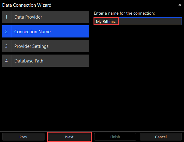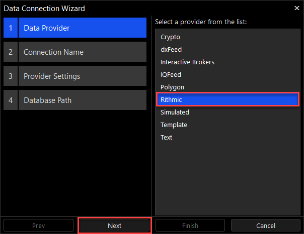 6.Select the desired data provider name from the list and click on the "Next" button (this example selects the Rithmic data connection).