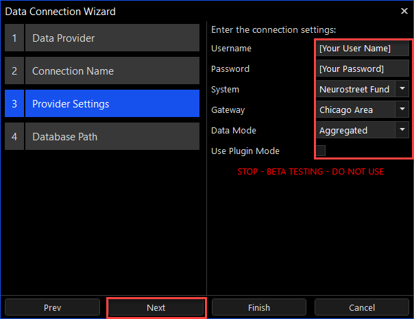 9.Enter the user name and password for your data connection and select the appropriate selections for the "System", "Gateway", "Data Mode" and "Use Plugin Mode" settings per the instructions provided by your data provider (this settings list applies to the Rithmic data connection example - Each data connection service may have unique configuration settings).
