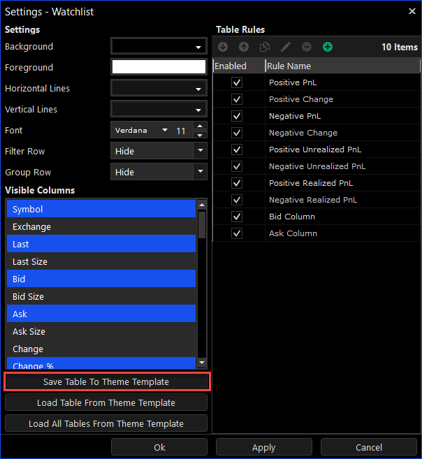 2.In the existing table (a watchlist in this case), right-click and select "Table Settings" (shown in the red rectangle) from the menu.