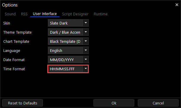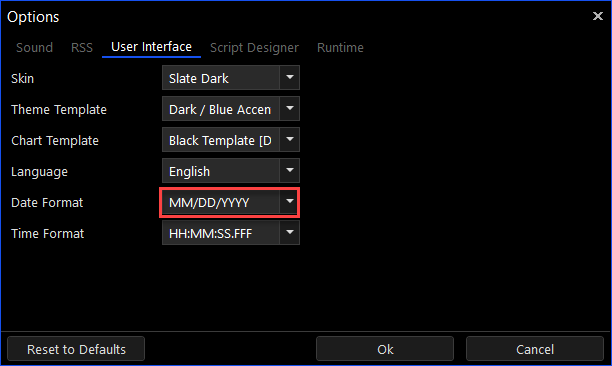 The Tickblaze platform supports all the common international Data and Time formats. The desired formats for Date and Time may be set in the Options dialog window as shown below.