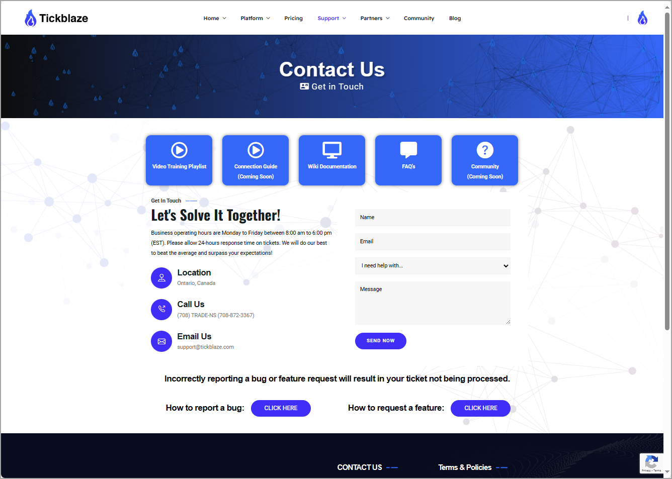 2.Go to https://tickblaze.com/contact-us/ to reach our Contact Us page. The Contact Us page will display as shown below: