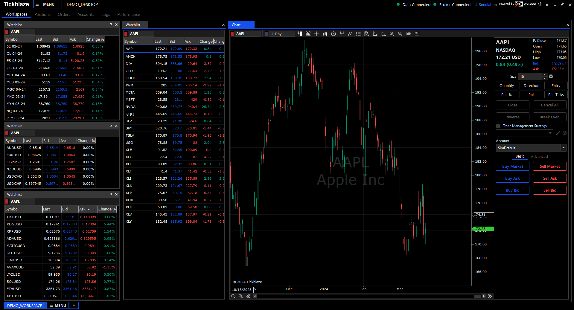 The platform will start with the default desktop and workspace loaded and it will automatically connect to the default data and broker connections. The screenshot below shows an example of a Standard Desktop: