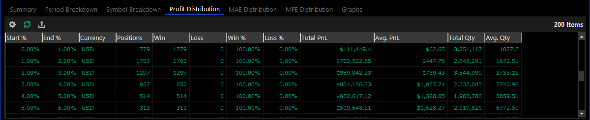 The profit distribution table takes all of the Desktop positions and groups them together by PnL% values. Each group of positions is used for calculating various performance metrics and then displayed as a single row in the table.