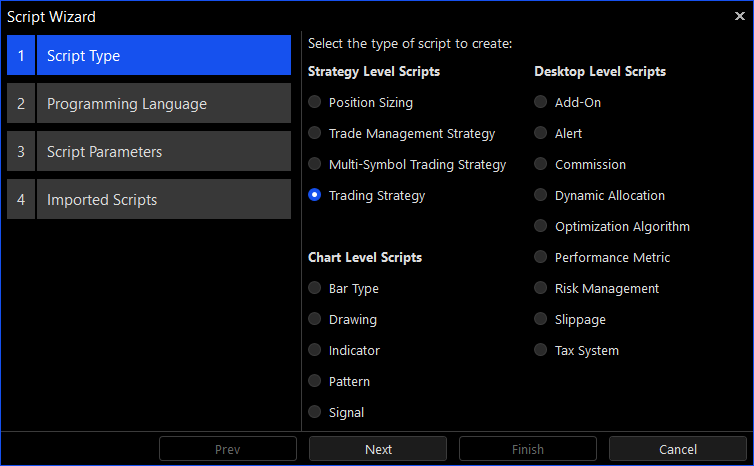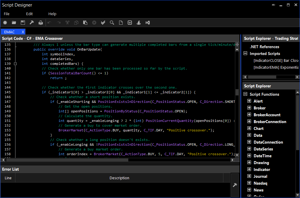 The Script Designer is the preferred Integrated Development Environment (IDE) for writing trading strategies and other supported script types. The designer can be used for creating and editing 18 different types of scripts using C# and Python.