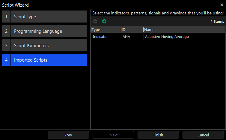 Some scripts can import and use Indicators, Signals, Patterns and Drawings from their code. Once a script with an ID of XYZ is added to this list, a new API function named SignalXYZ, DrawingXYZ, IndicatorXYZ or PatternXYZ is created. This new function accepts the same parameters accepted by the script's OnInitialize function and is used for creating new instances of it.