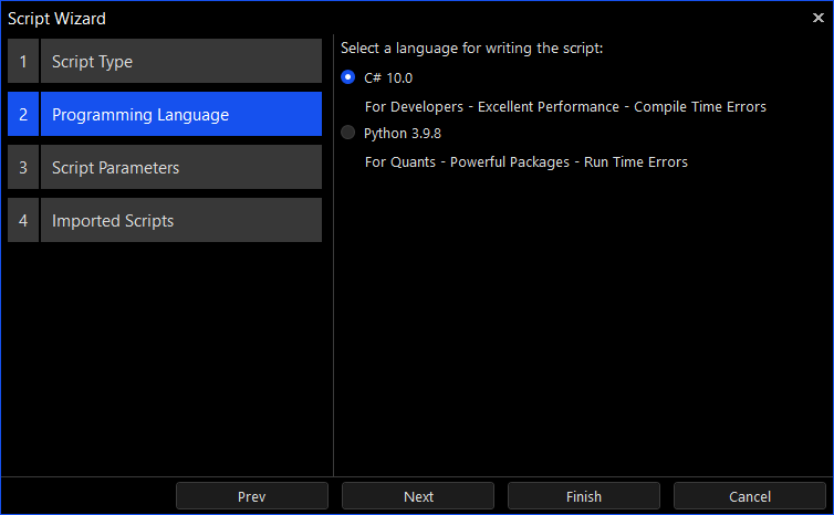 Tickblaze scripts can be coded in either C# or Python. Python is by far the most popular language for quants, mostly due to its huge selection of packages and easy to learn syntax. C# is mostly suited for professional developers who are more familiar with C based language such as C#, Java or C++.