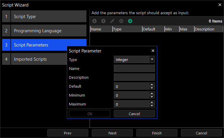 These parameters can either be added from the Script Wizard or directly from the script itself. We highly recommend that you add, edit and remove parameters using the Script Wizard instead of manually from the script itself.