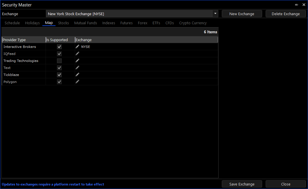 In the map tab you can specify the exchange mnemonics used by the data and broker providers to identify the exchange.