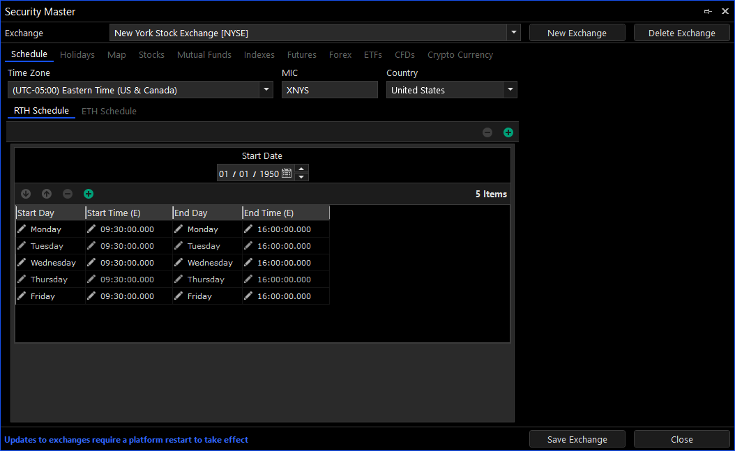 The Security Master is used for creating and editing exchanges. Each exchange maps to a single destination and includes all of its symbols, trading schedules and market holidays, among others. The exchange definitions are extensively used by the platform and are automatically updated as part of our service. You can update the exchange definitions from our latest distribution by going to Menu\Desktops\Update System Resources.