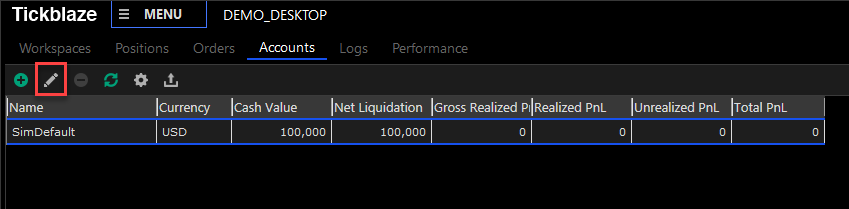 1.Click on the Accounts tab "SimDefault" account row. This will enable the account editing tools.