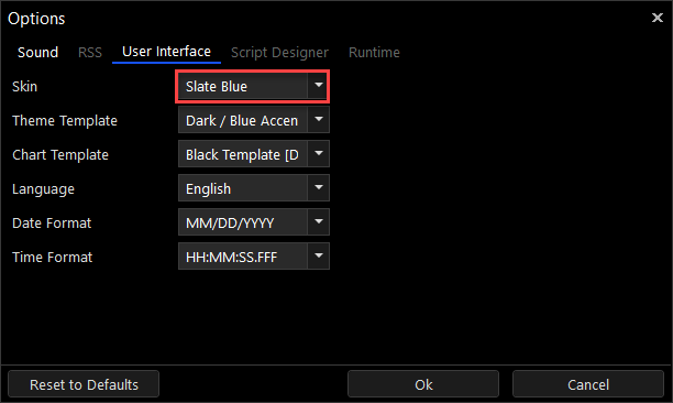 User Interface Skins are collections of color schemes for the Tickblaze user interface windows. Out of the box, Tickblaze comes with four built-in skins the user can select to customize the user interface windows color schemes.