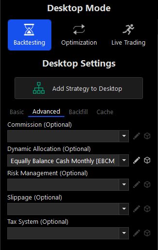 Dynamic Allocation scripts can be assigned to a Quant Desktop from the Advanced tab in the Desktop Settings. Only after a Dynamic Allocation script is assigned does the Transfers tab appear in the Desktop.