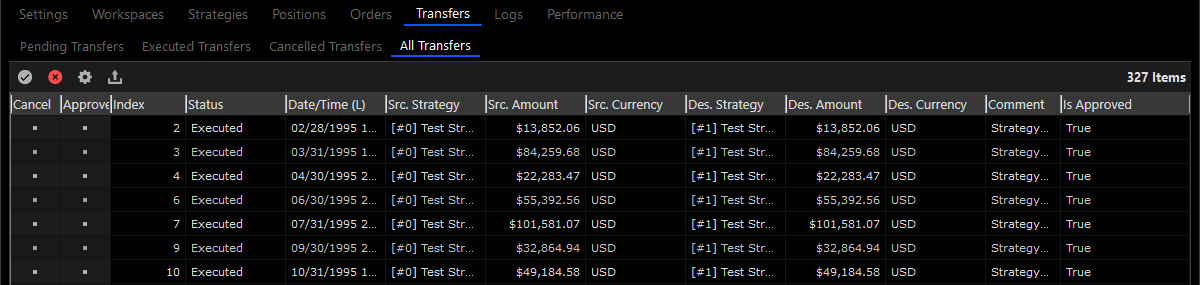 The transfers table displays the transfer transactions created by the Desktop Dynamic Allocation script. Dynamic Allocation scripts are used for systematically redistributing cash between Desktop strategies based on their performance or some other heuristic. This table is only available for Quant Desktops that have a Dynamic Allocation script assigned to them.