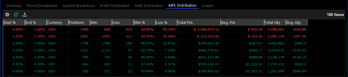 The MFE distribution table takes all of the Desktop positions and groups them together by MFE% values. Each group of positions is used for calculating various performance metrics and then displayed as a single row in the table.
