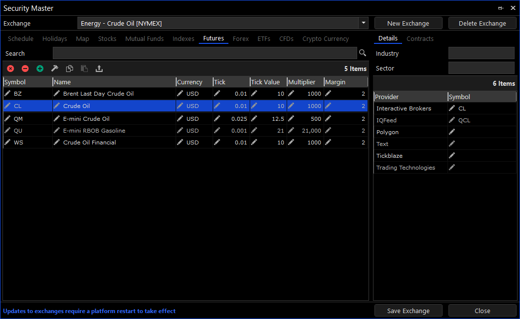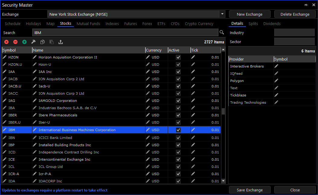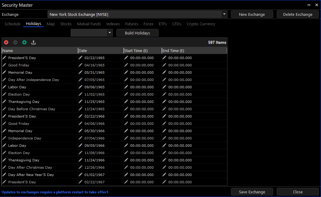 The Security Master is used for creating and editing exchanges. Each exchange maps to a single destination and includes all of its symbols, trading schedules and market holidays, among others. The exchange definitions are extensively used by the platform and are automatically updated as part of our service. You can update the exchange definitions from our latest distribution by going to Menu\Desktops\Update System Resources.