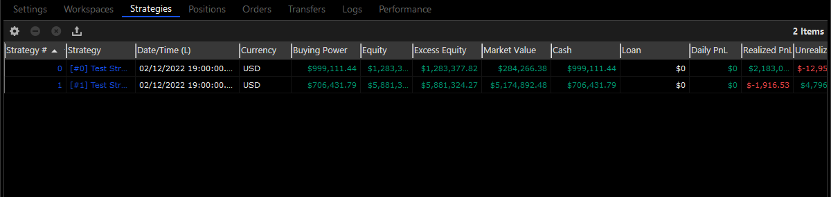 Each one of the Strategy Desktop strategies has its own virtual trading account with its own virtual funding. The strategies table is used to display a real time summary of these virtual trading accounts, including their cash, equity, excess equity, market value, orders and positions.