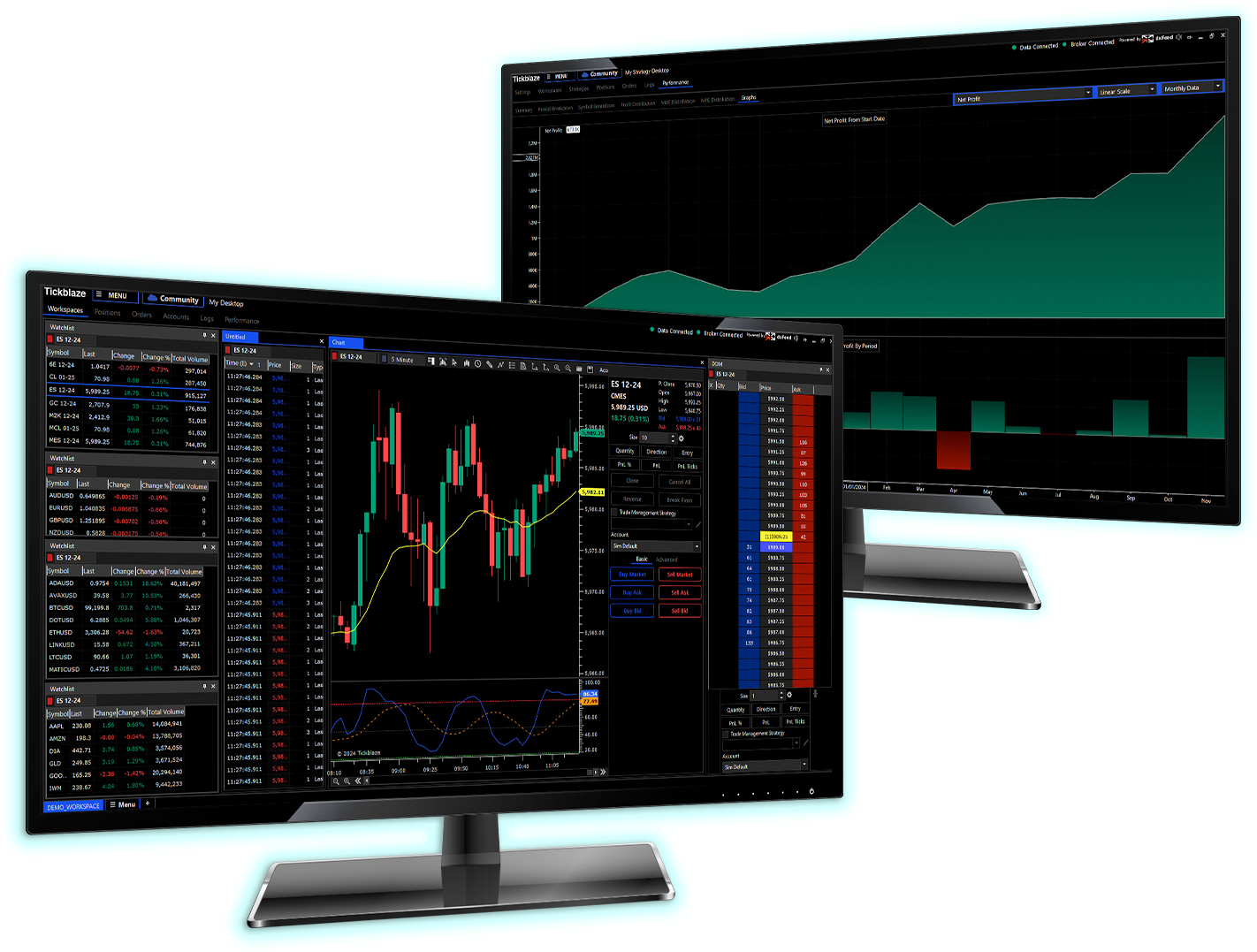 - Tickblaze Desktop, Web (TradingView charts), and Mobile App