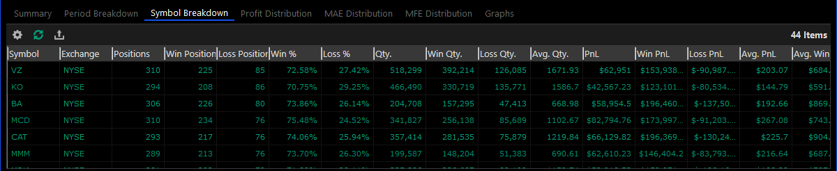 The symbol breakdown displays aggregated performance results for each symbol in the Desktop.